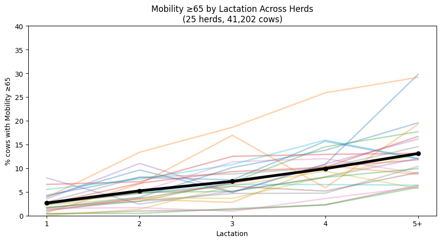 There is a clear pattern of higher prevalence as lactations progress. Around 2.7% of first-lactation cows show impaired mobility. This rises to just over 5% in second lactation, 7% in third, close to 10% in fourth, and over 13% in cows that make it to fifth lactation and beyond.